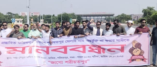 প্রস্তাবিত ফরিদপুর বিভাগে শরীয়তপুরের নাম অন্তর্ভুক্ত না করার দাবিতে পদ্মা সেতু টোল প্লাজার জাজিরা প্রান্তে সড়ক অবরোধ করে বিক্ষোভ করেছে জাগো শরীয়তপুর নামের একটি সংগঠন। মঙ্গলবার (১৪ অক্টোবর), সকাল ১০টায় পদ্মা সেতু টোল প্লাজা জাজিরা প্রান্তে প্রথমে মানববন্ধন শুরু করেন আন্দোলনকারীরা। একপর্যায়ে মানববন্ধন শেষ করে আধাঘন্টা সড়ক অবরোধ করে বিক্ষোভ প্রদর্শন করে। এতে টোল প্লাজার সামনের সড়কে তীব্র যানজট সৃষ্টি হয়। এতে ভোগান্তিতে পড়ে যাত্রীবাহী ও পণ্যবাহী যানবাহন। পরে পুলিশের অনুরোধে বিক্ষোভকারীরা অবরোধ তুলে নিলে যান চলাচল স্বাভাবিক হয়।