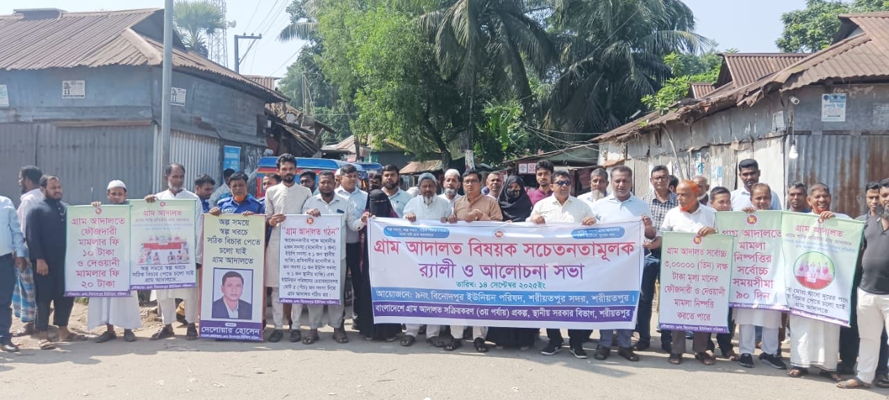 শরীয়তপুর সদর উপজেলার বিনোদপুর ইউনিয়ন পরিষদের আয়োজনে এবং সদর উপজেলা নির্বাহী অফিসার এবং গ্রাম আদালত (৩য় পর্যায়) প্রকল্পের সহযোগিতায় “গ্রাম আদালত বিষয়ক বর্ণাঢ্য র্যালি, পথ সভা এবং আলোচনা সভা অনুষ্ঠিত হয়েছে। এ উপলক্ষ্যে মঙ্গলবার (১৪ সেপ্টেম্বর ২০২৫) সকাল ১০ ঘটিকায় উক্ত অনুষ্ঠানের আয়োজন করা হয়। অত্র বিনোদপুর ইউনিয়নে গ্রাম আদালতের ব্যাপক প্রচারণায় উৎসবমুখর সাধারণ মানুষ ।